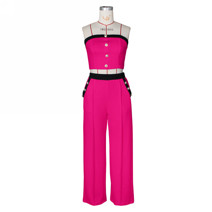 2025 Women's Sexy Color-Block Halter Top & Wide-Leg Pants Set – High Waist Straight Cut with Decorative ButtonsSKU: #c4145-6