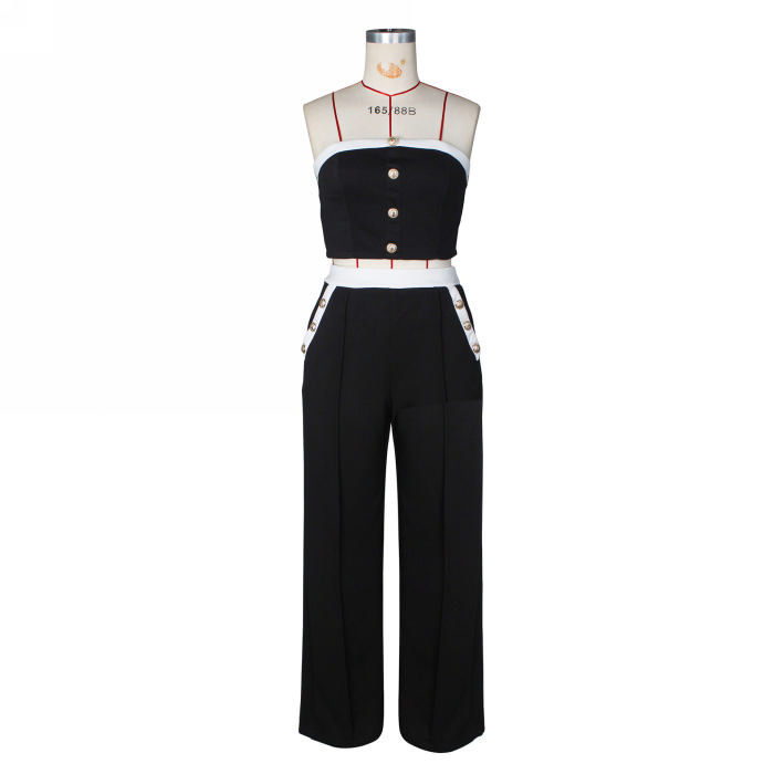2025 Women's Sexy Color-Block Halter Top & Wide-Leg Pants Set – High Waist Straight Cut with Decorative ButtonsSKU: #c4145-2