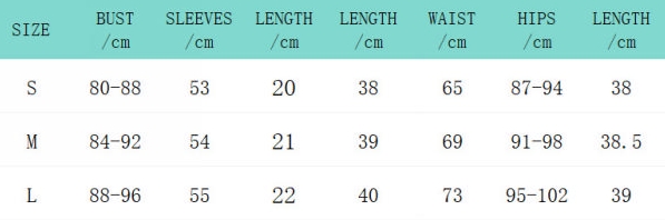 | Size | Bust | Waist | Hips |