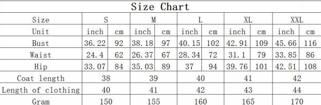 | XL - 170/92A | 36¼ | 30 | 38½ |