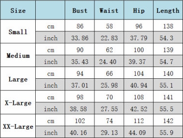 | Size | Bust | Waist | Hips |