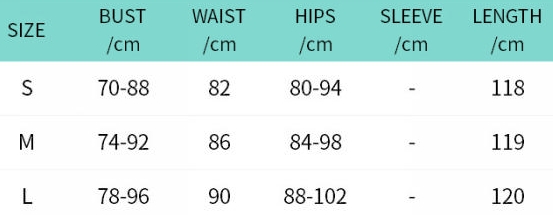 | Size | Bust | Waist | Hips |