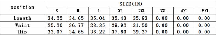| Size | Bust | Waist | Hips |