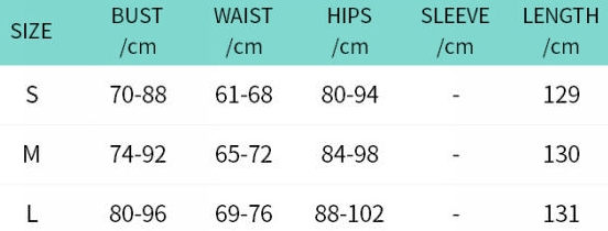 | Size | Bust | Waist | Hips |