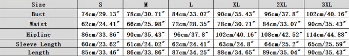 | Size | Bust | Waist | Hips |