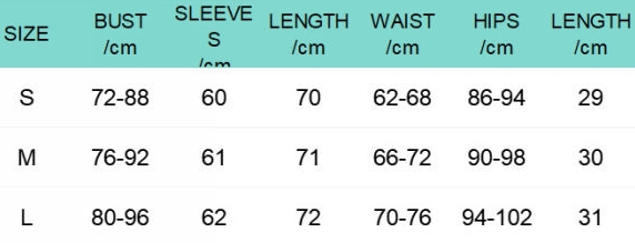 | Size | Bust | Waist | Hips |