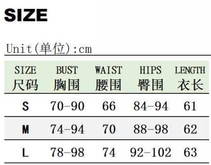 | Size | Bust | Waist | Hips |