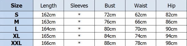 | Size | Bust | Waist | Hips |