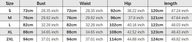 | Size | Bust | Waist | Hips |