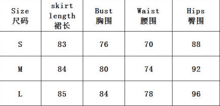| Size | Bust | Waist | Hips |