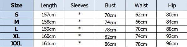 | Size | Bust | Waist | Hips |