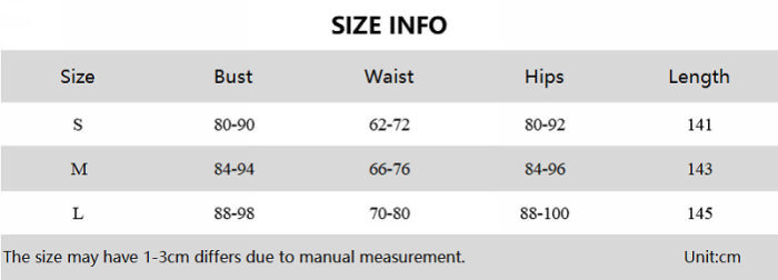 | Size | Bust | Waist | Hips |