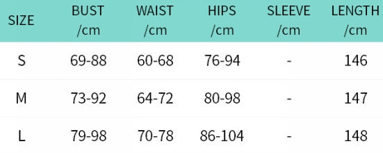 | Size | Bust | Waist | Hips |
