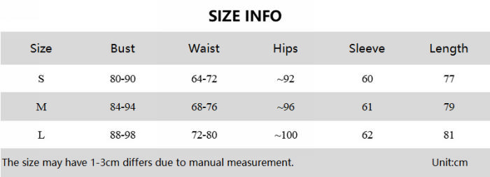 | Size | Bust | Waist | Hips |