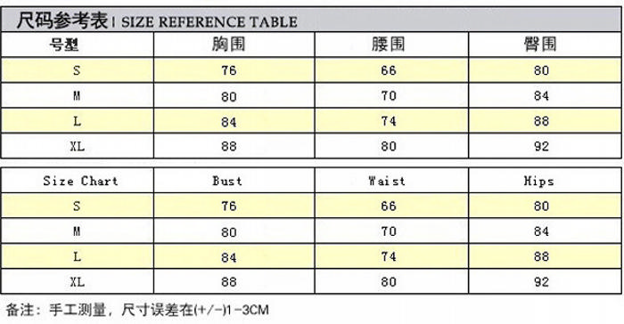 | Size | Bust | Waist | Hips |