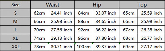 | Size | Bust | Waist | Hips |