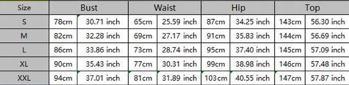| Size | Bust | Waist | Hips |