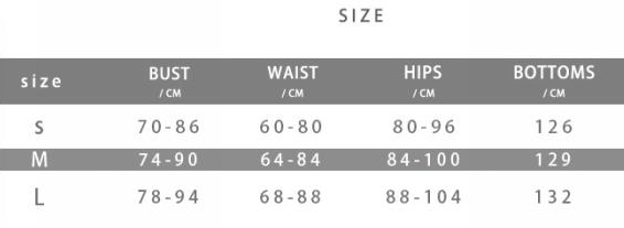 | Size | Bust | Waist | Hips |