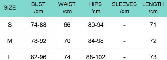 | Size | Bust | Waist | Hips |