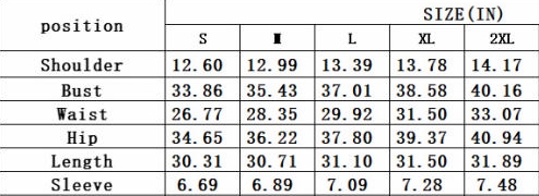 | Size | Bust | Waist | Hips |