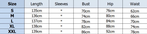 | Size | Bust | Waist | Hips |