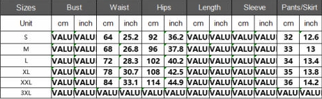 | Size | Bust | Waist | Hips |