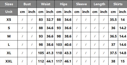 | Size | Bust | Waist | Hips |