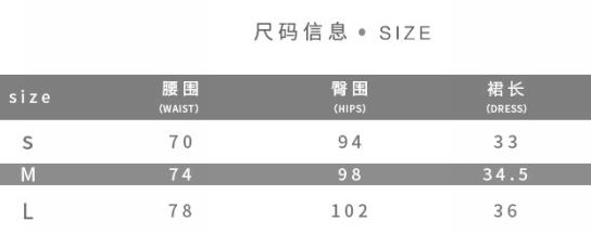 | Size | Bust | Waist | Hips |