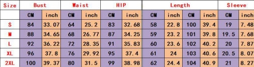 | Size | Bust | Waist | Hips |