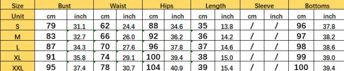 | Size | Bust | Waist | Hips |
