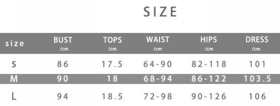 | Size | Bust | Waist | Hips |