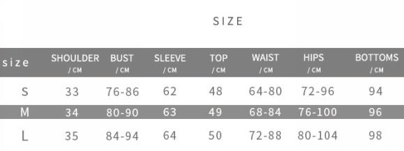 | Size | Bust | Waist | Hips |