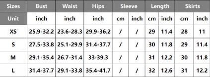 | Size | Bust | Waist | Hips |