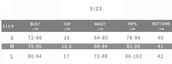 | Size | Bust | Waist | Hips |