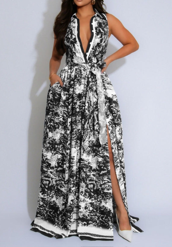 2025 New Women's Floral Print Maxi Dress – Fashionable, Sexy High Slit, Bohemian Flowy Dress with BeltSKU: #c4144-2