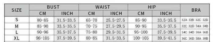 | Size | Bust | Waist | Hips |