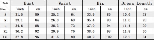 | Size | Bust | Waist | Hips |