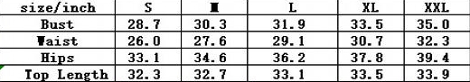 | Size | Bust | Waist | Hips |