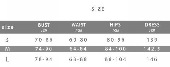 | Size | Bust | Waist | Hips |