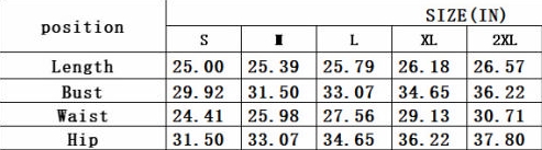 | Size | Bust | Waist | Hips |