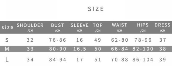 | Size | Bust | Waist | Hips |