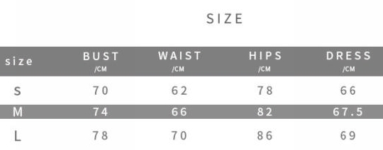 | Size | Bust | Waist | Hips |