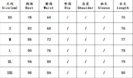 | Size | Bust | Waist | Hips |