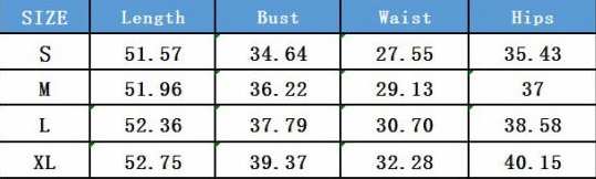 | Size | Bust | Waist | Hips |