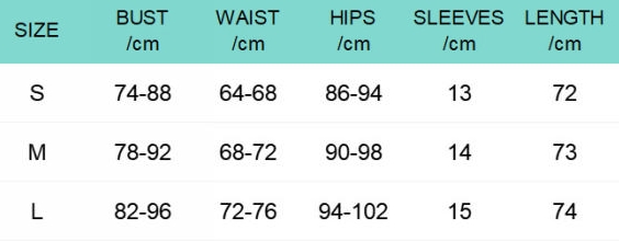 | Size | Bust | Waist | Hips |