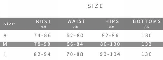 | Size | Bust | Waist | Hips |