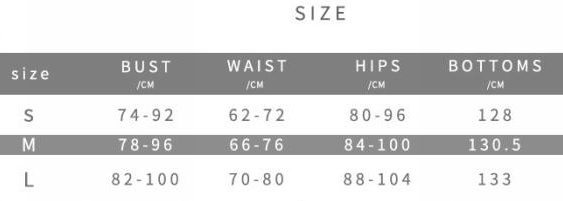 | Size | Bust | Waist | Hips |