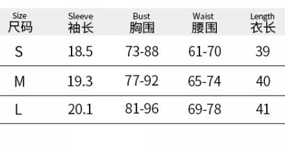 | Size | Bust | Waist | Hips |
