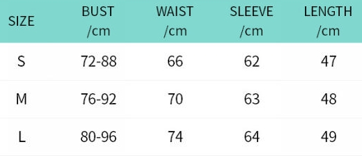 | Size | Bust | Waist | Hips |