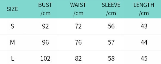 | Size | Bust | Waist | Hips |